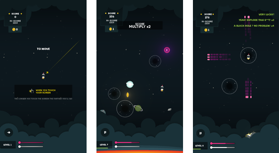 🎰 Lottery: Try the space wheel! Tap the screen and turn the moon to earn bonuses and powers to help you during your next game. With that, you should be able to go further into this colorful interstellar journey to level up and collect more skins!