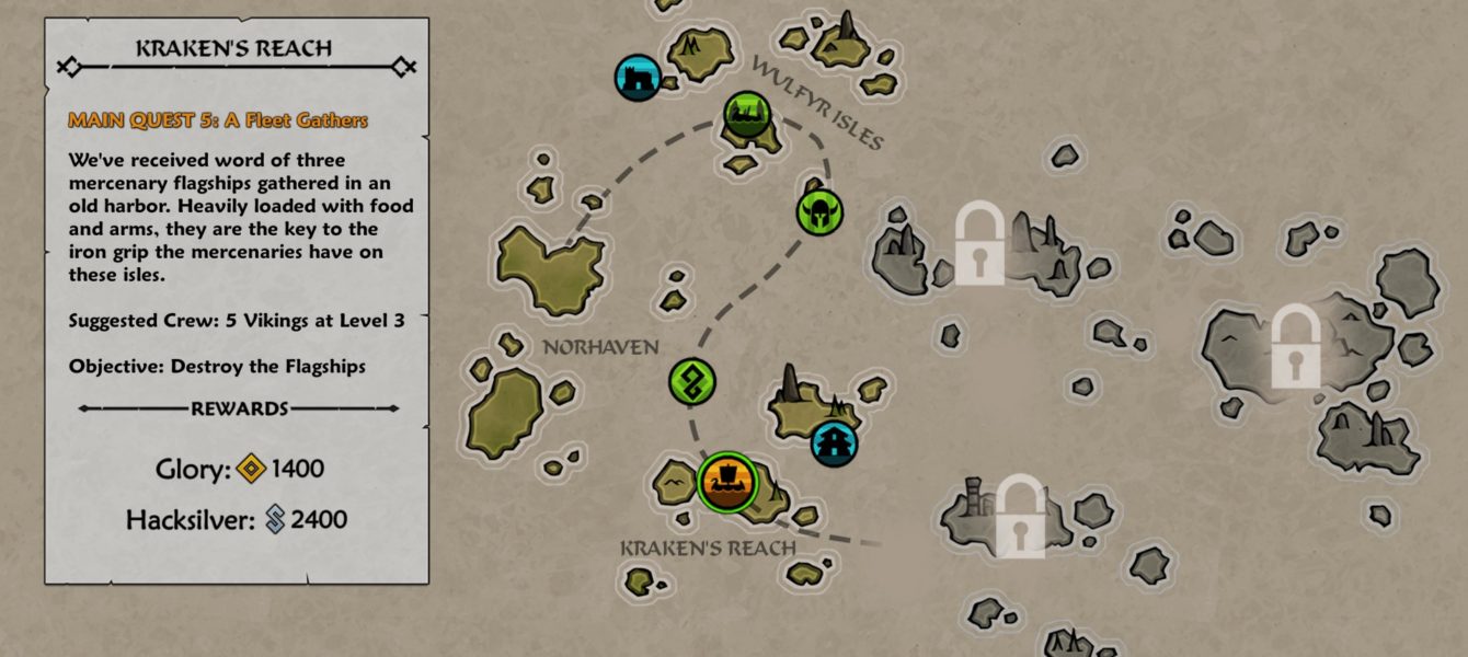 § A Place to Call Home: After a successful voyage, return to your stronghold of Norhaven. Purchase newly available wares, recruit new warriors, and plan the next raiding season.