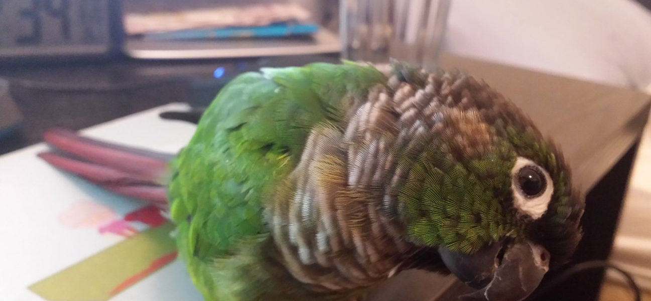 So a few of you want to hear more about Kiwi, our green cheek conure. Kiwi is molting currently, getting ready for spring mating season. He has been obsessed with cleaning his feathers and making sure he looks nice. We got him a new accessory for his cage – a sort of skewer that holds vegetables and hangs in his cage. He has been enjoying these fresh fruit and vegetable sticks hanging in his cage very much.